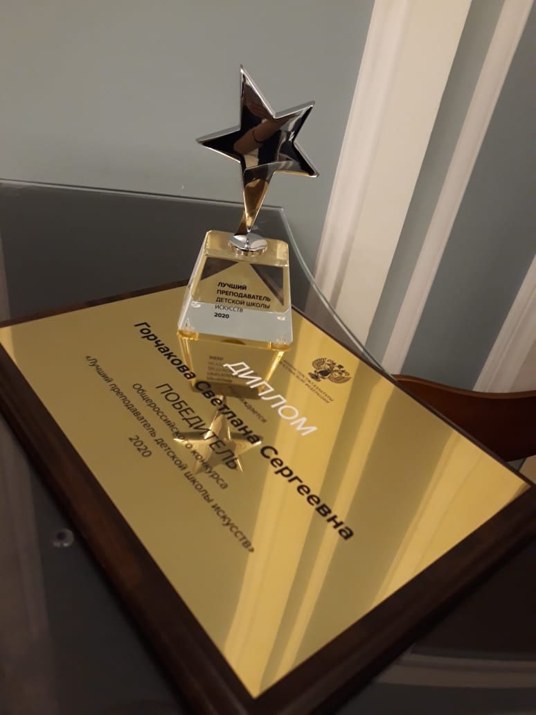10 декабря 2020г. в Российском фонде культуры состоялась церемония награждения лауреатов Общероссийского конкурса «Лучший преподаватель детской школы искусств». Победу в этом престижном конкурсе, учрежденном Минкультуры России, одержала Светлана Сергеевна Горчакова, преподаватель Детской художественной школы № 3 им. Е.В.Гурова г. Омска. В борьбе за высокую награду в 2020 г. приняли участие 446 педагогов из 56 регионов России.