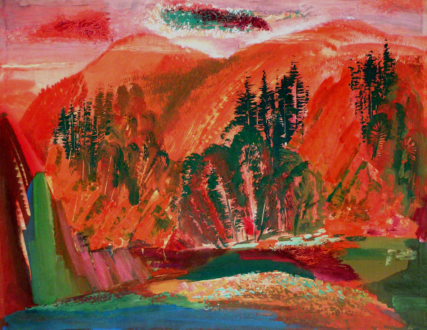 Евгений Васильевич был редкий колорист – это не раз отмечали искусствоведы. Цвет является одним из основных инструментов творческого метода художника. В его работах лирика и музыка, динамика и напряженность. Листы его то горят малиновым заревом, то погружаются в холодный туман, они то уводят нас в багровый лес, то несут по золотой речке.